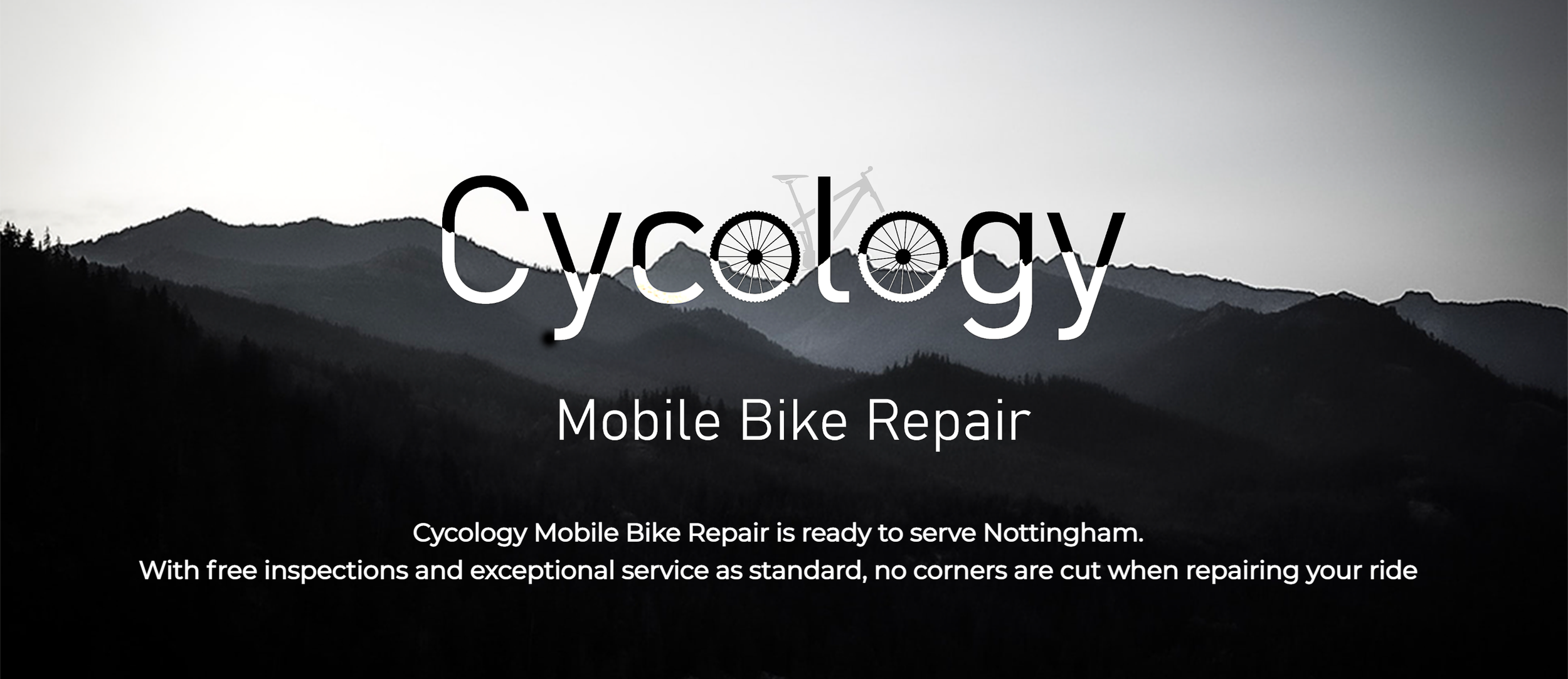 A promotional image for Cyclogy Mobile Bike Repair featuring a black and white mountain landscape with a large bicycle wheel integrated into the text, and a faint bicycle silhouette in the sky. The text mentions bike repair services in Nottingham with free inspections and no corners cut.