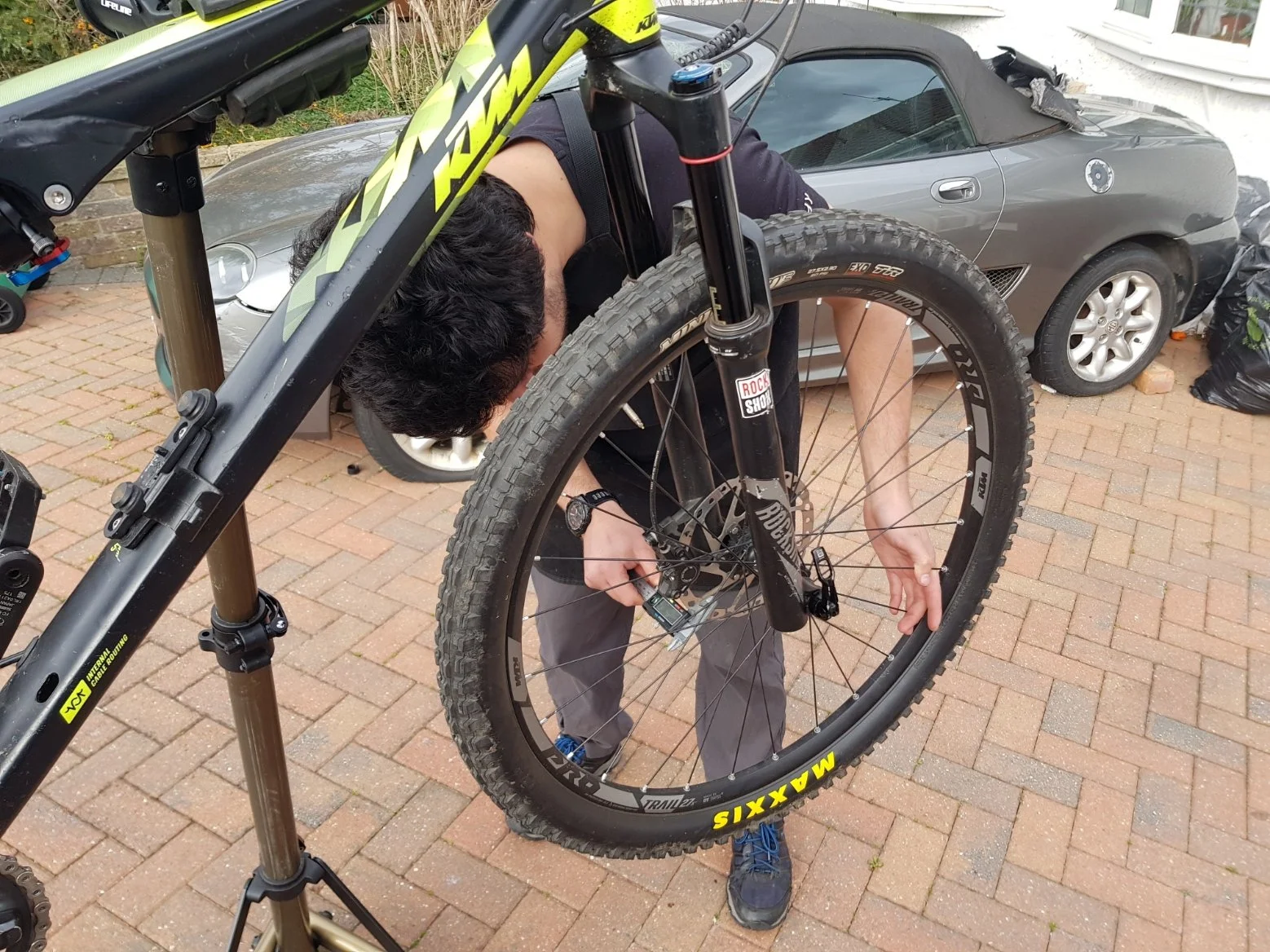 A man cleaning a black and blue mountain bike with a yellow cloth outdoors on a sunny day.